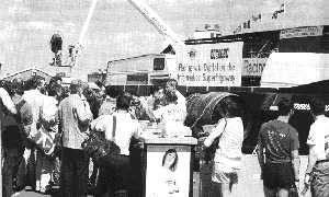 Richard Noble describes the ThrustSSC Roadshows as one of our most important activities, and rightly so, since a major goal of the whole project is to make it as interactive as possible for the maximum number of people. The Roadshows are where the team gets to meet and interact with a whole variety of people who are there for just one reason - because they are genuinely interested in the project. The shows have the added benefit of being very enjoyable and earning valuable revenue for the project. The Roadshow concept grew out of two events in the project's history, the SMMT Motor Show at the NEC, Birmingham, and the announcement of Andy Green at Brooklands as the driver of ThrustSSC. For the Motor Show, Richard Noble commissioned special effects master Geoff Luff to build a fullsize mock-up of the car complete with one of the actual Spey engines to be used on the record attempt. Such was the success of its first appearance that we were soon besieged by show organisers who wanted Thrust as a major attraction for their events.