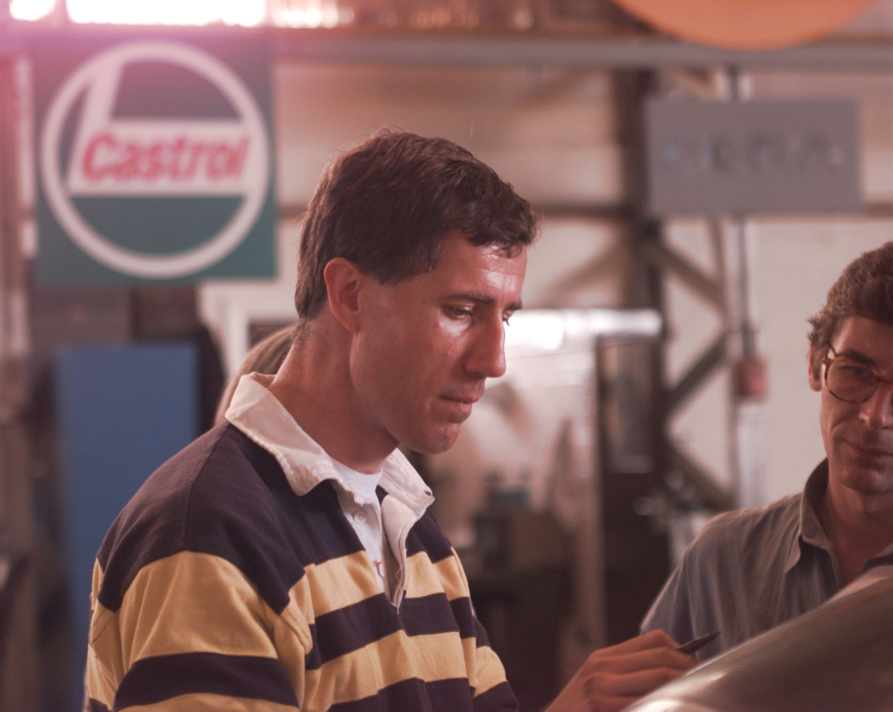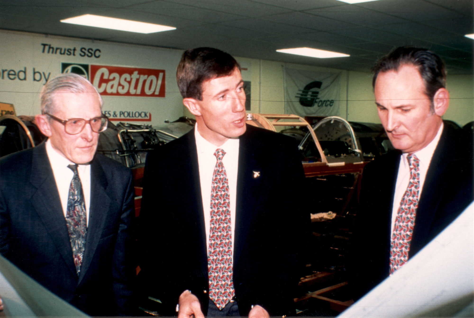 Ron Ayers (Aerodynamicist), Andy Green (Driver) and Richard Noble (Director) studying plans of Thrust SSC
